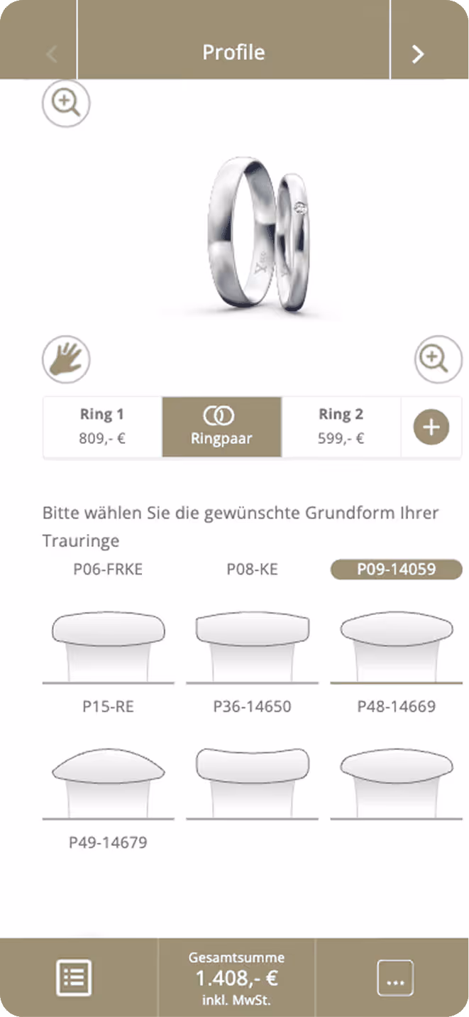 Wenn sich erste Favoriten zeigen, gehen wir gemeinsam an den Bildschirm. Dort kannst du den Ring digital konfigurieren. Stein, Material, Fassung – alles ist anpassbar, und du siehst direkt, wie sich das auf Optik und Preis auswirkt.