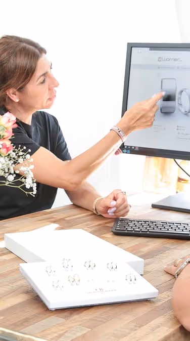 Wenn sich erste Favoriten zeigen, gehen wir gemeinsam an den Bildschirm. Dort kannst du den Ring digital konfigurieren. Stein, Material, Fassung – alles ist anpassbar, und du siehst direkt, wie sich das auf Optik und Preis auswirkt.